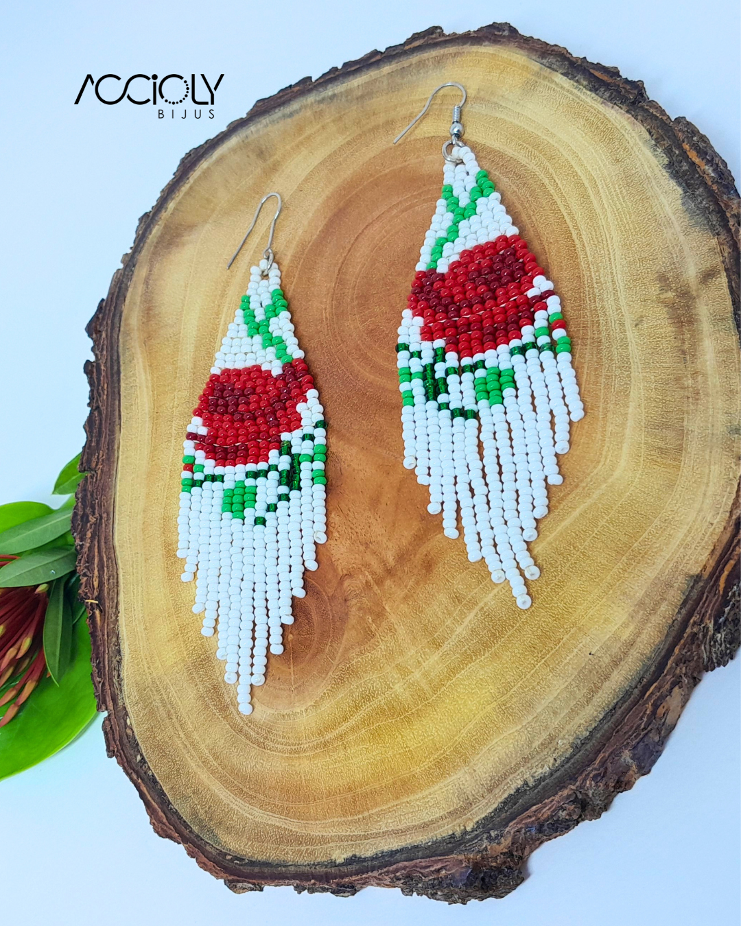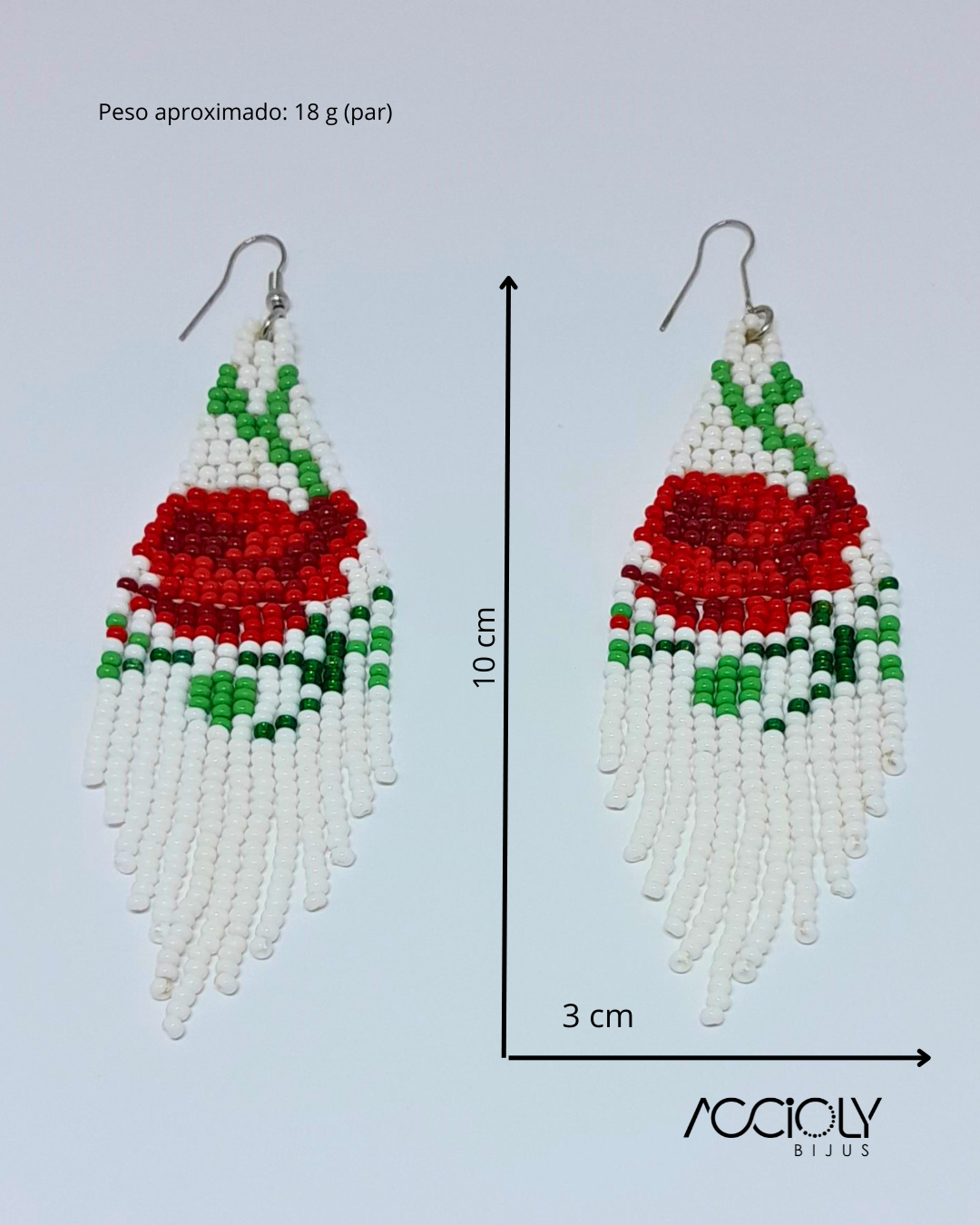 Este brinco destaca uma flor em contraste com tons de verde, criando uma combinação que remete à tranquilidade dos jardins floridos, ao mesmo tempo em que mostra a personalidade forte representada na flor vermelha.