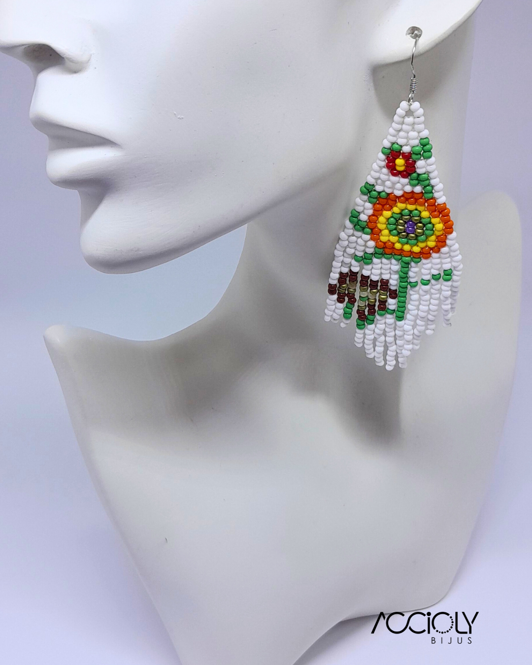 Conheça o Brinco Branco Floral de Miçangas Tchecas, uma peça delicada e encantadora que traz uma combinação harmoniosa de cores: vermelho, amarelo, marrom, laranja e lilás.