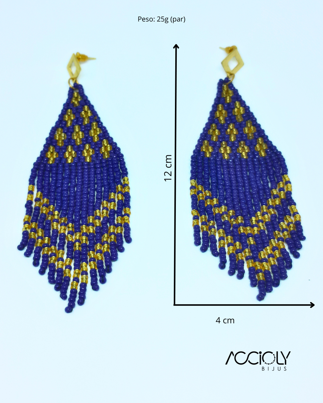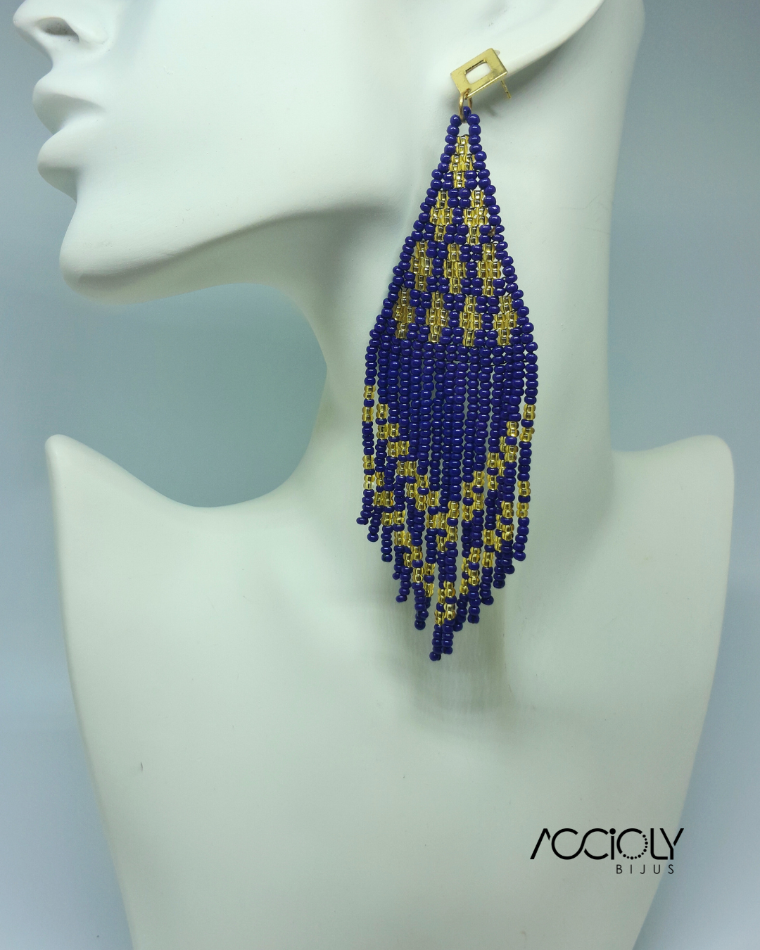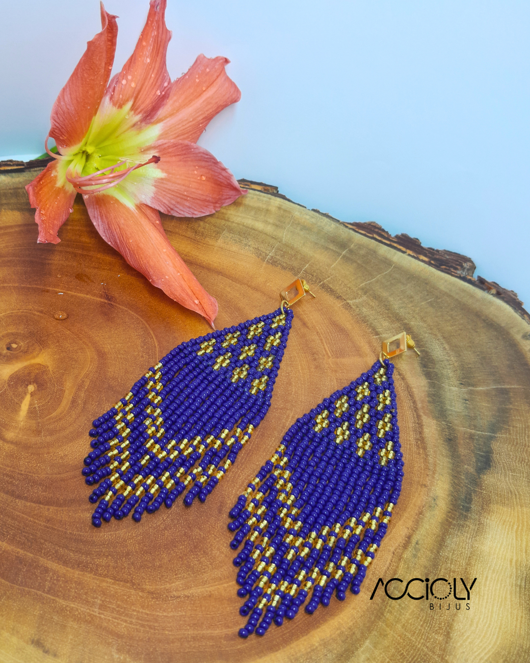 Apresentamos o nosso Brinco de miçangas tchecas azul e dourado, uma peça que une o brilho do dourado ao tom vibrante azul.