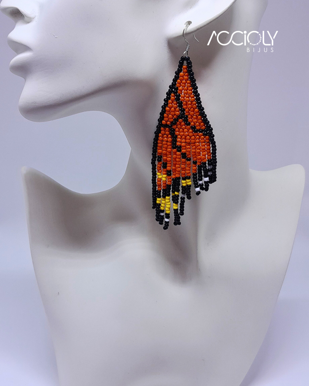 A beleza das miçangas tchecas é realçada pelo design delicado em formato de asas de borboletas, trazendo um toque de charme e originalidade ao seu visual, com destaque para a cor laranja em contraste com o preto.