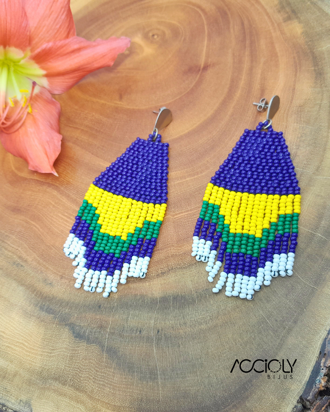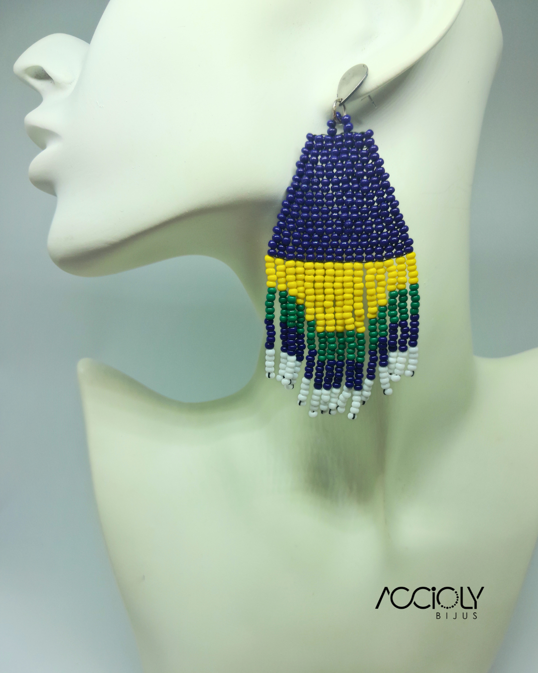 Apresentamos o Brinco de Miçangas Tchecas Brasil, um acessório que une alegria e elegância com as cores vibrantes da nossa bandeira: azul, verde, amarelo e branco.