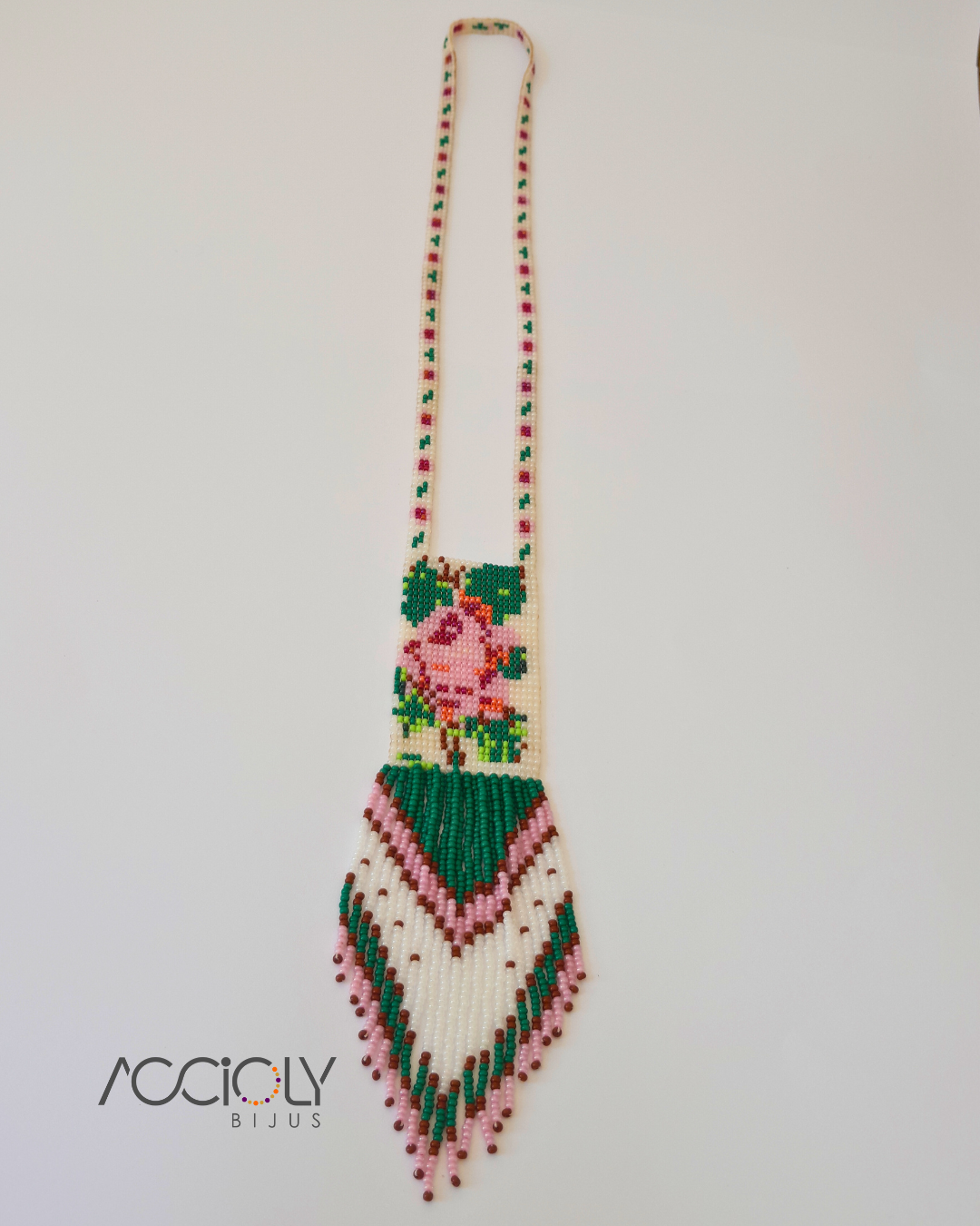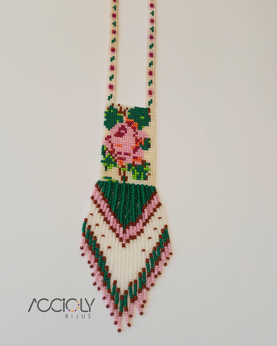 Esse acessório delicado traz em destaque as cores verde e rosa, formando um lindo desenho floral, e uma franja que arremata com leveza o design feito de maneira artesanal.