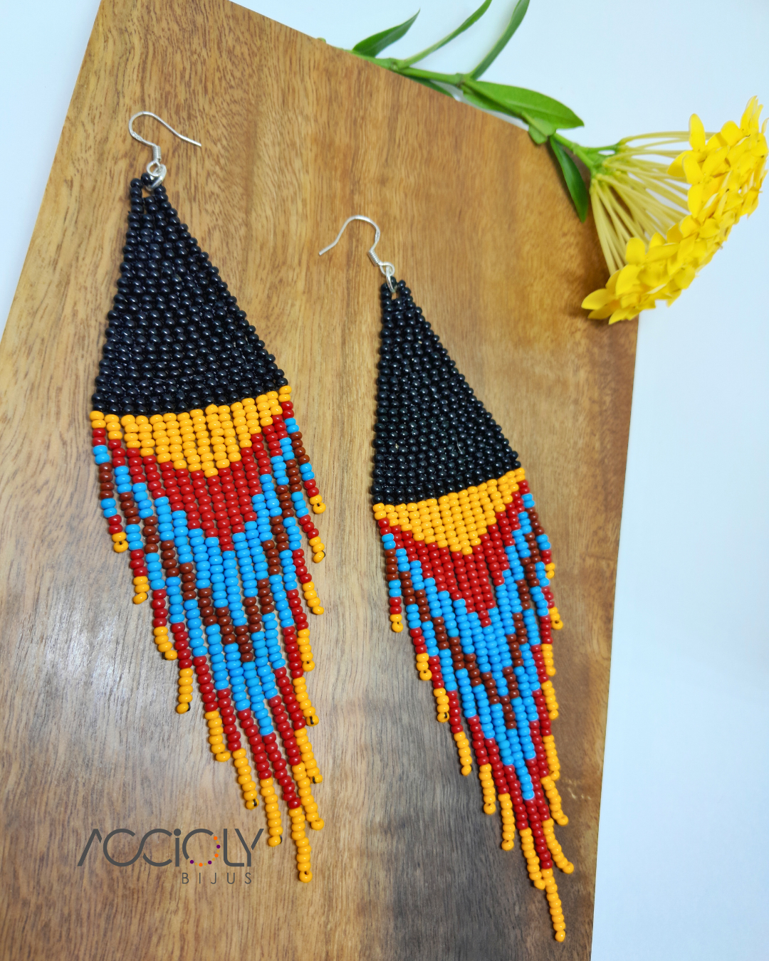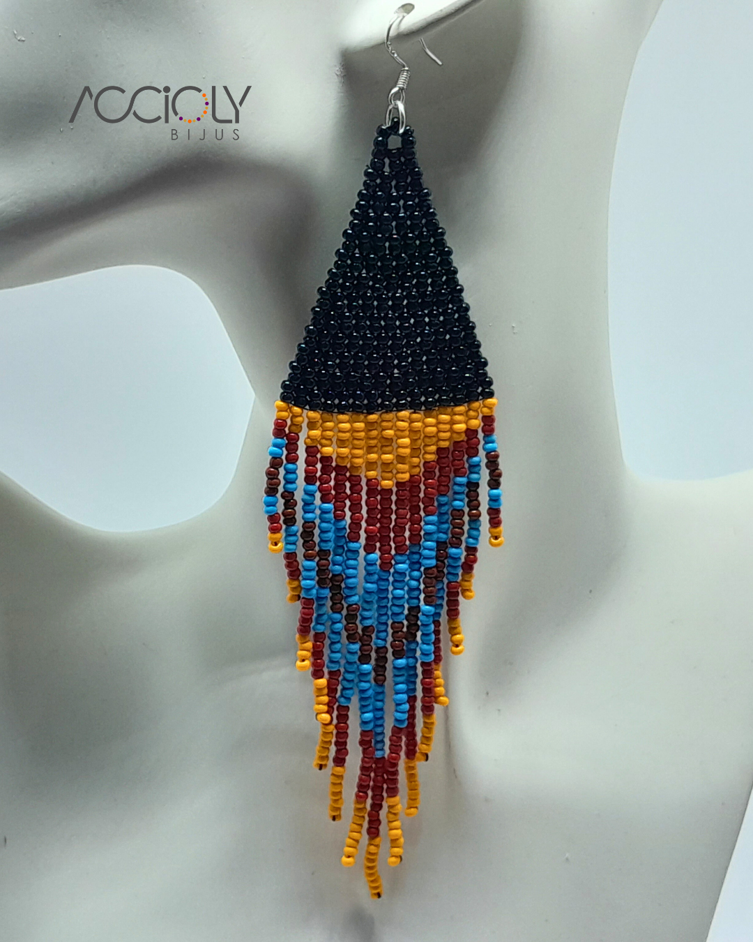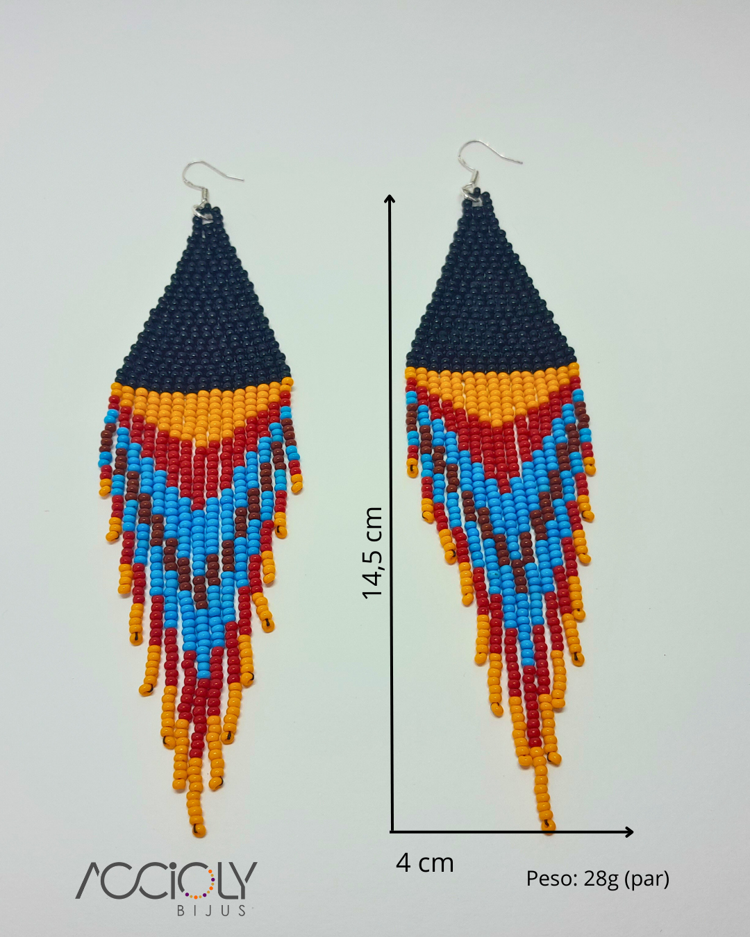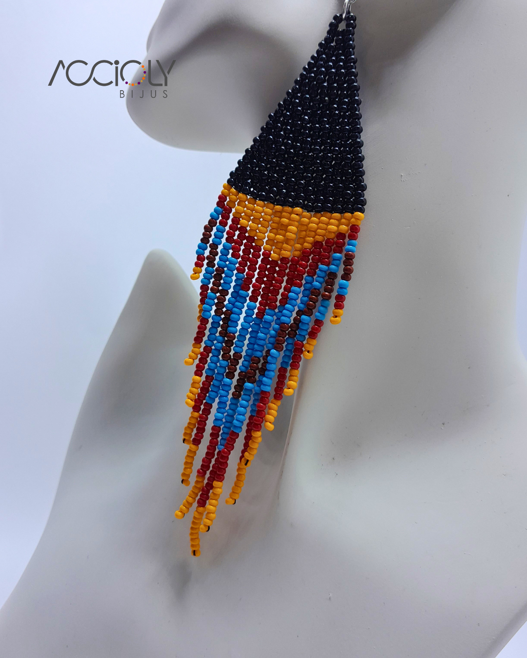 Com tons de preto, laranja, vermelho e azul, este brinco remete a uma sensação de conexão com culturas e tradições ao redor do mundo, enquanto as cores vibrantes adicionam um toque de energia e vitalidade ao seu visual.