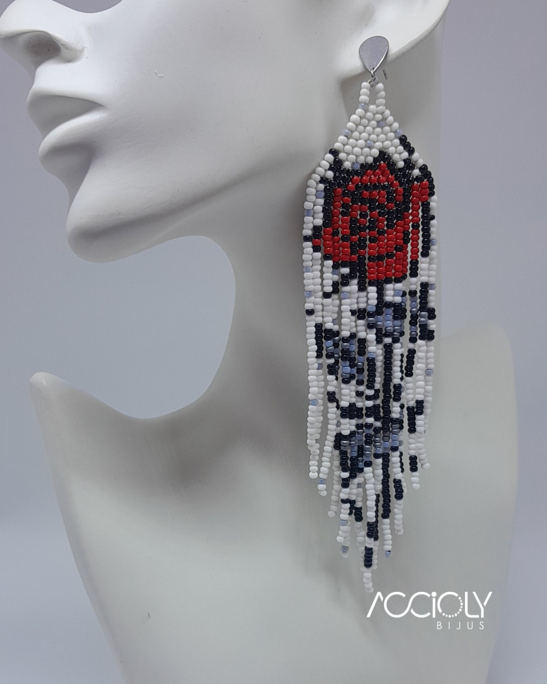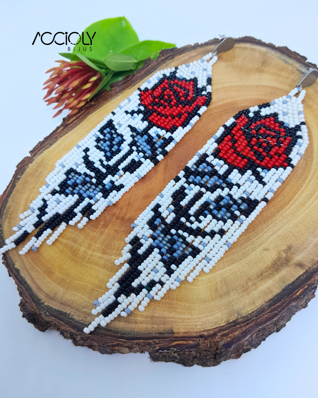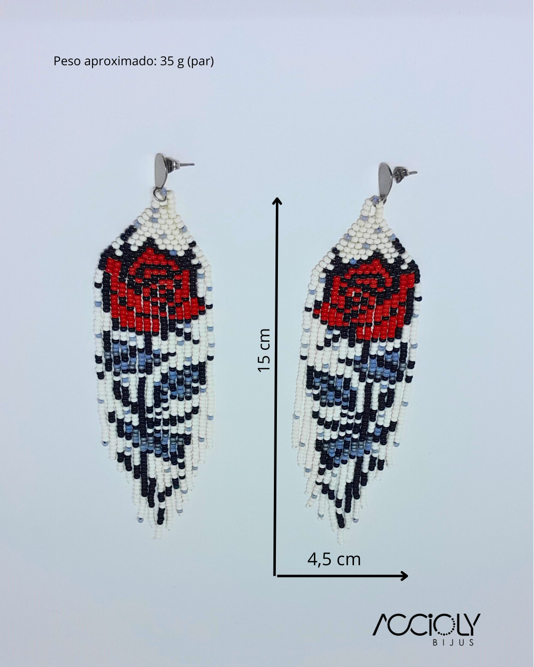 Com uma vibrante flor vermelha como destaque, este brinco também inclui tons de preto, cinza e branco, criando uma composição equilibrada e moderna. O design é complementado por um fecho de metal em formato de gota, que adiciona um toque de requinte e exclusividade.