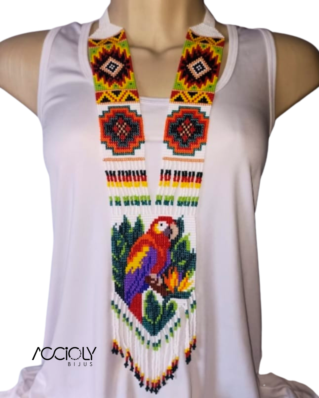 As cores incluem vermelho, laranja, amarelo, verde, azul e preto. No centro do colar, uma linda representação da arara vermelha.
